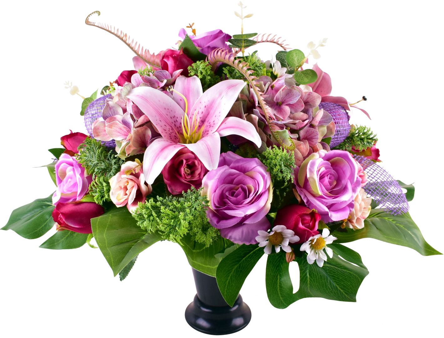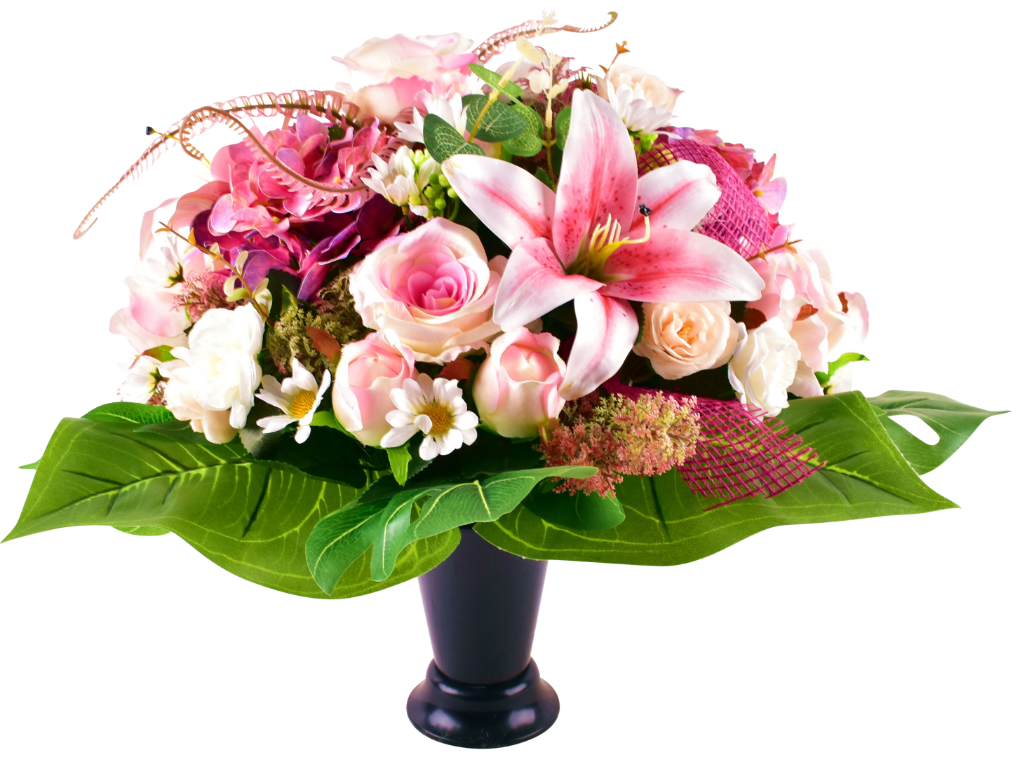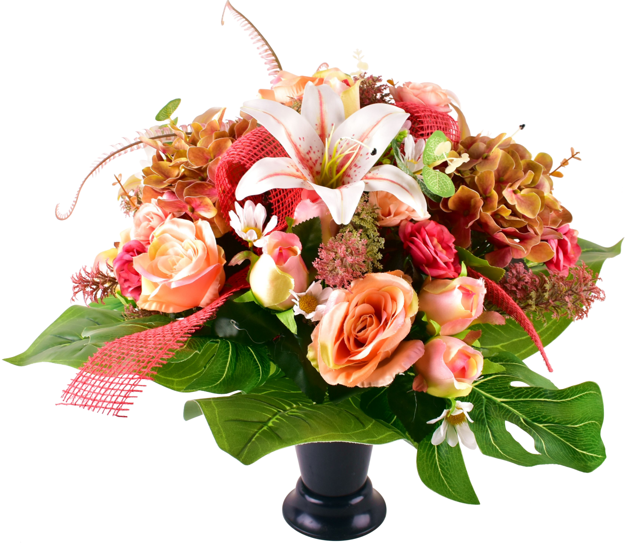 Cône, rose, boutons, lys, hortensia, gardénia, cyprès, ruban jute, support lesté.