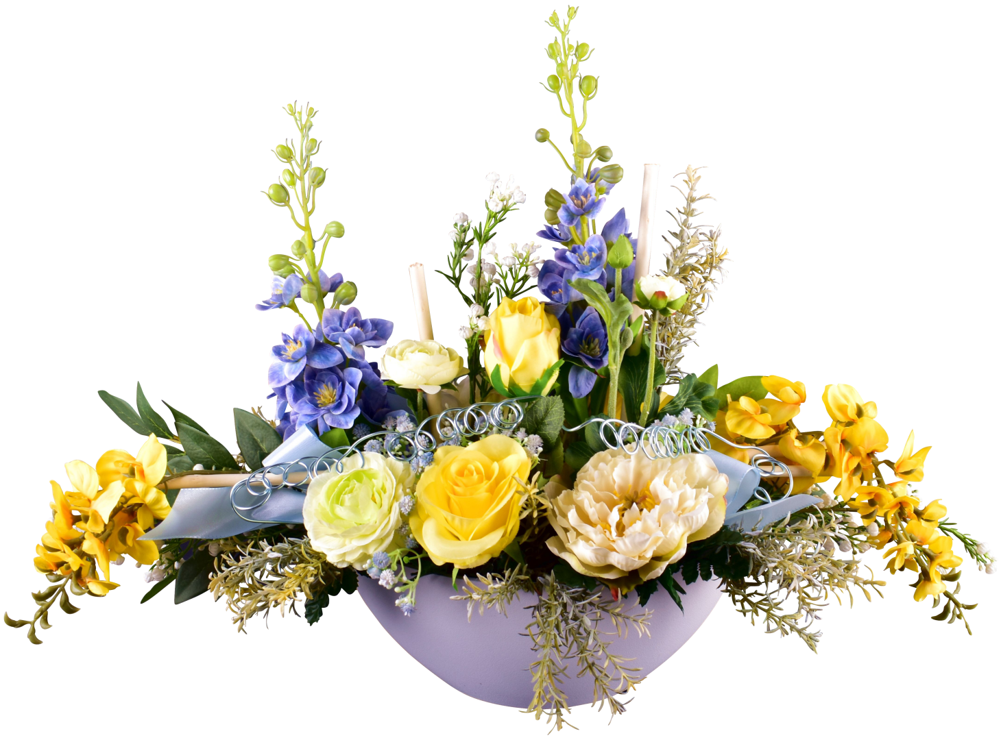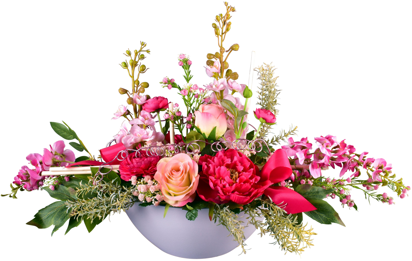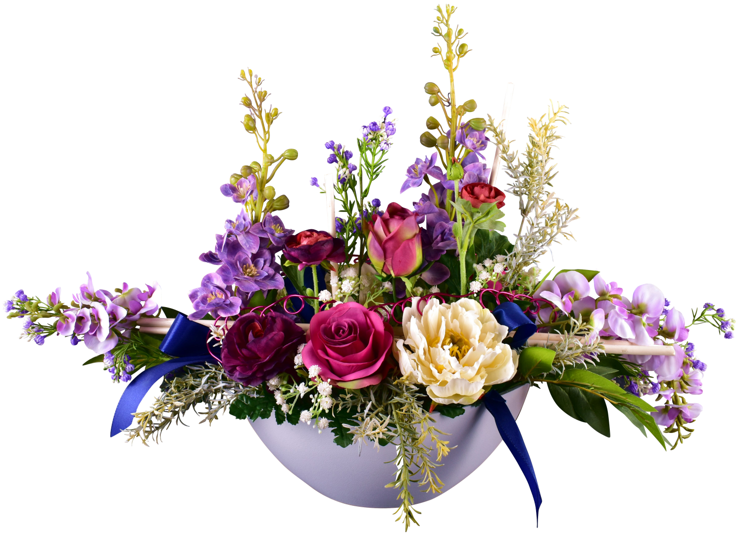 Coupe ovale, delphinium, rose, pivoine, renoncule, glycine, osier blanc, taffetas, fil laiton, support lesté.