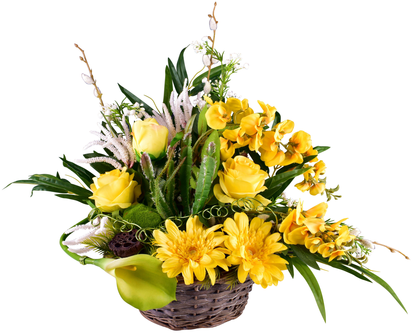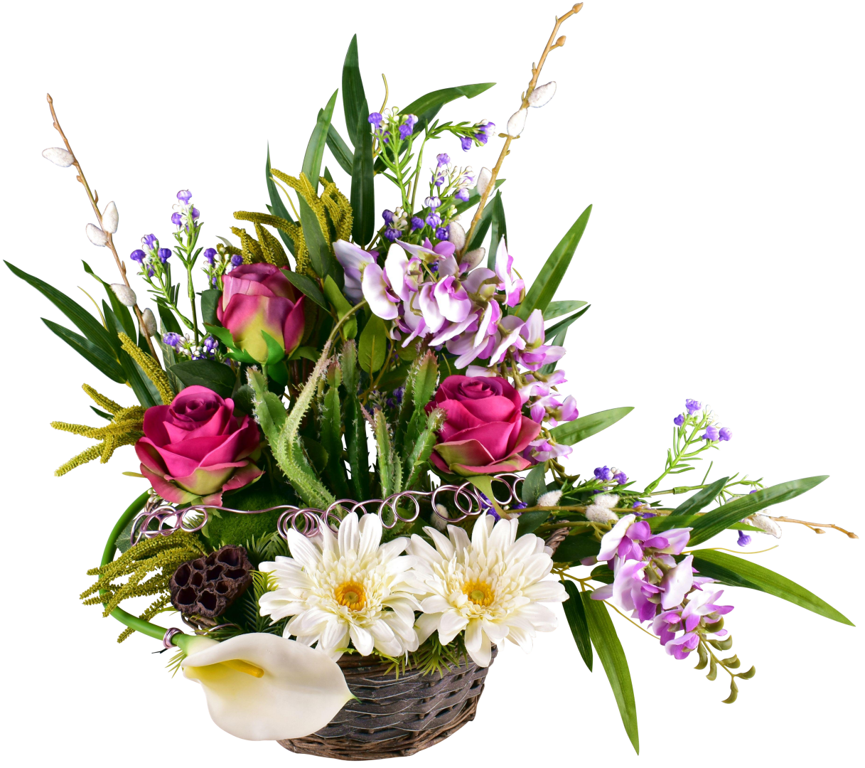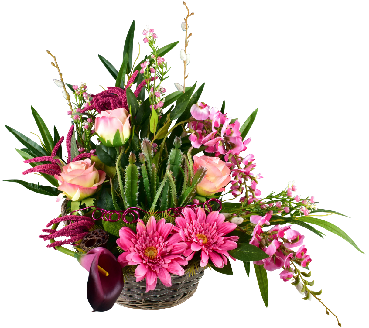 Panier, rose, glycine, callas, gerbera, succulent, support lesté.