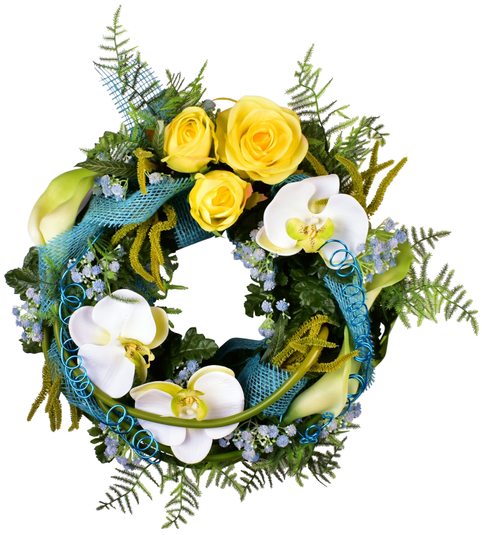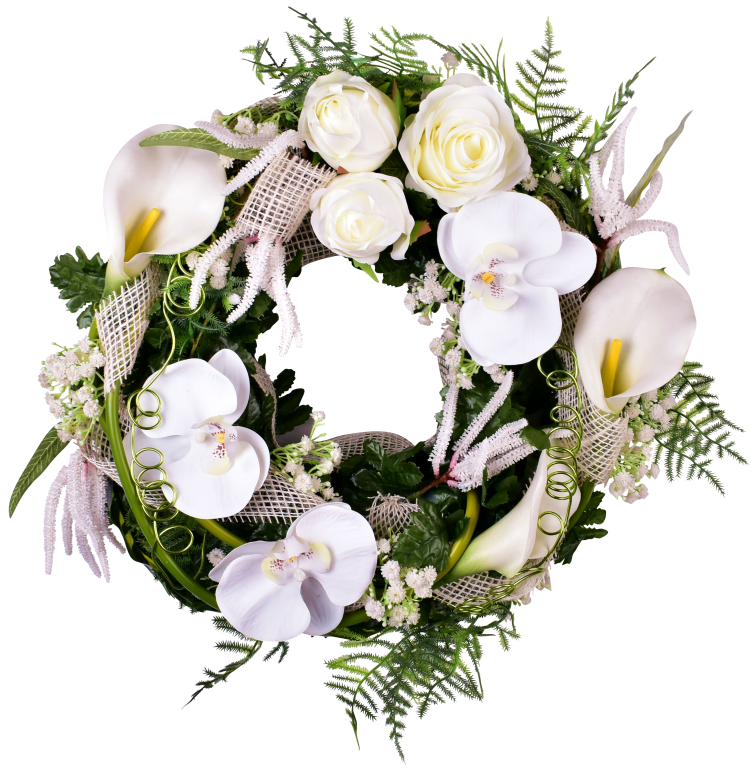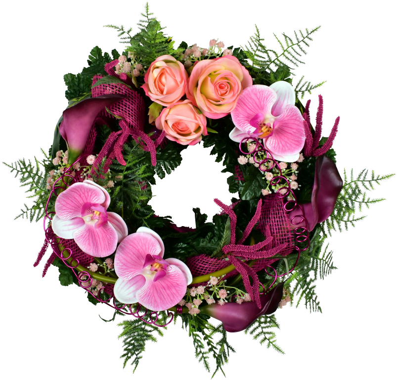 Couronne, rose, phalénopsis, arum. Gypsophile, ruban et fil aluminium coloré. Support lesté.