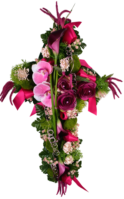 Croix, rose, phalénopsis, arum. Shamrock, gypsophile, ruban et épingles. Support lesté