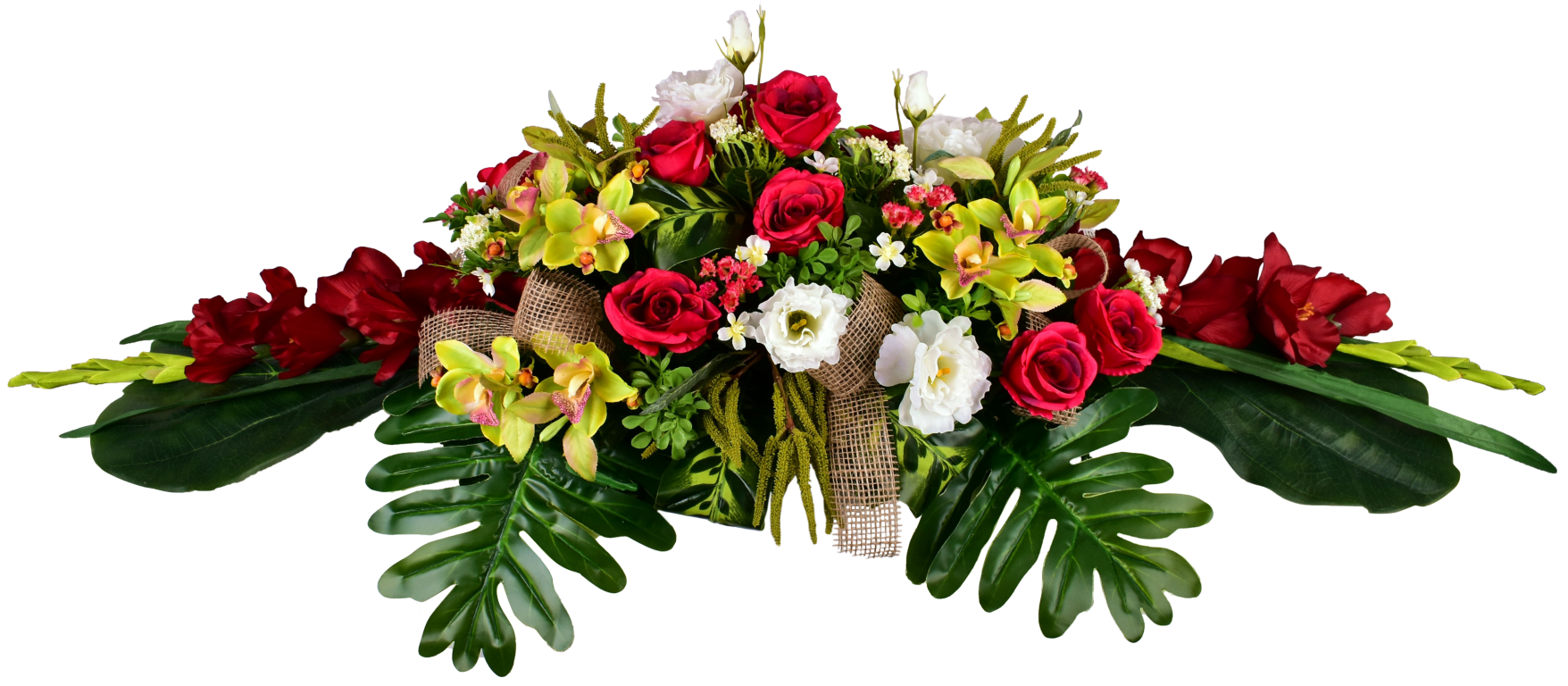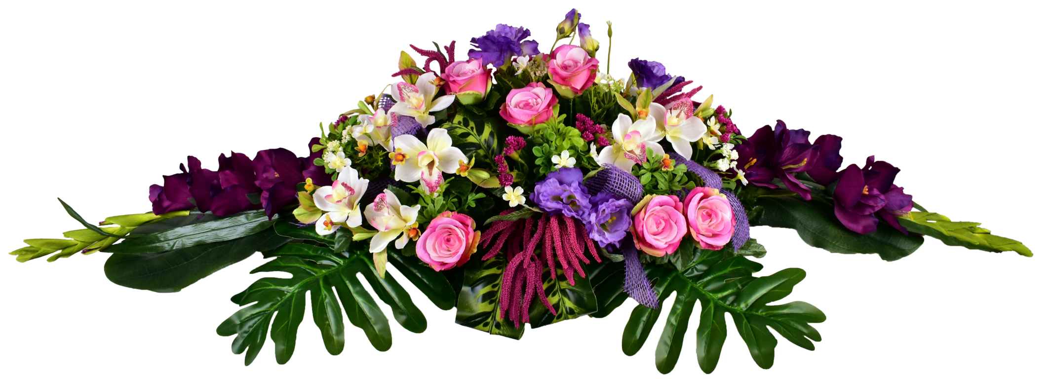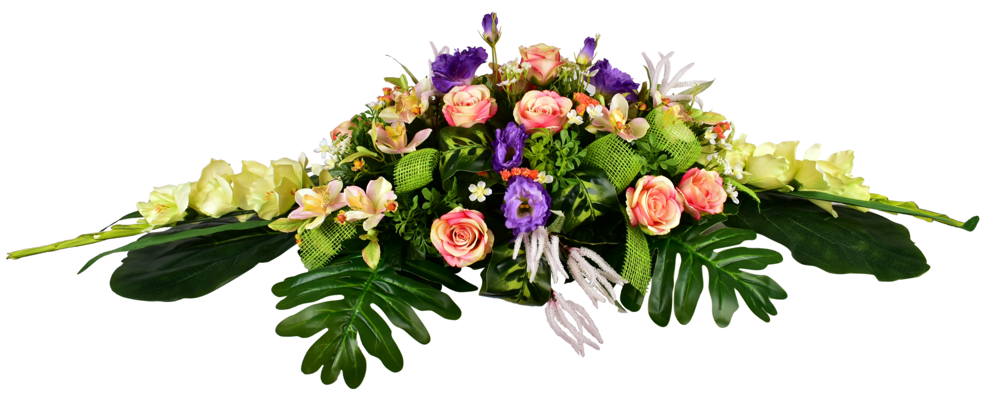 Raquette, cymbidium, glaieul, astilbe. Buis et ruban. Support lesté.