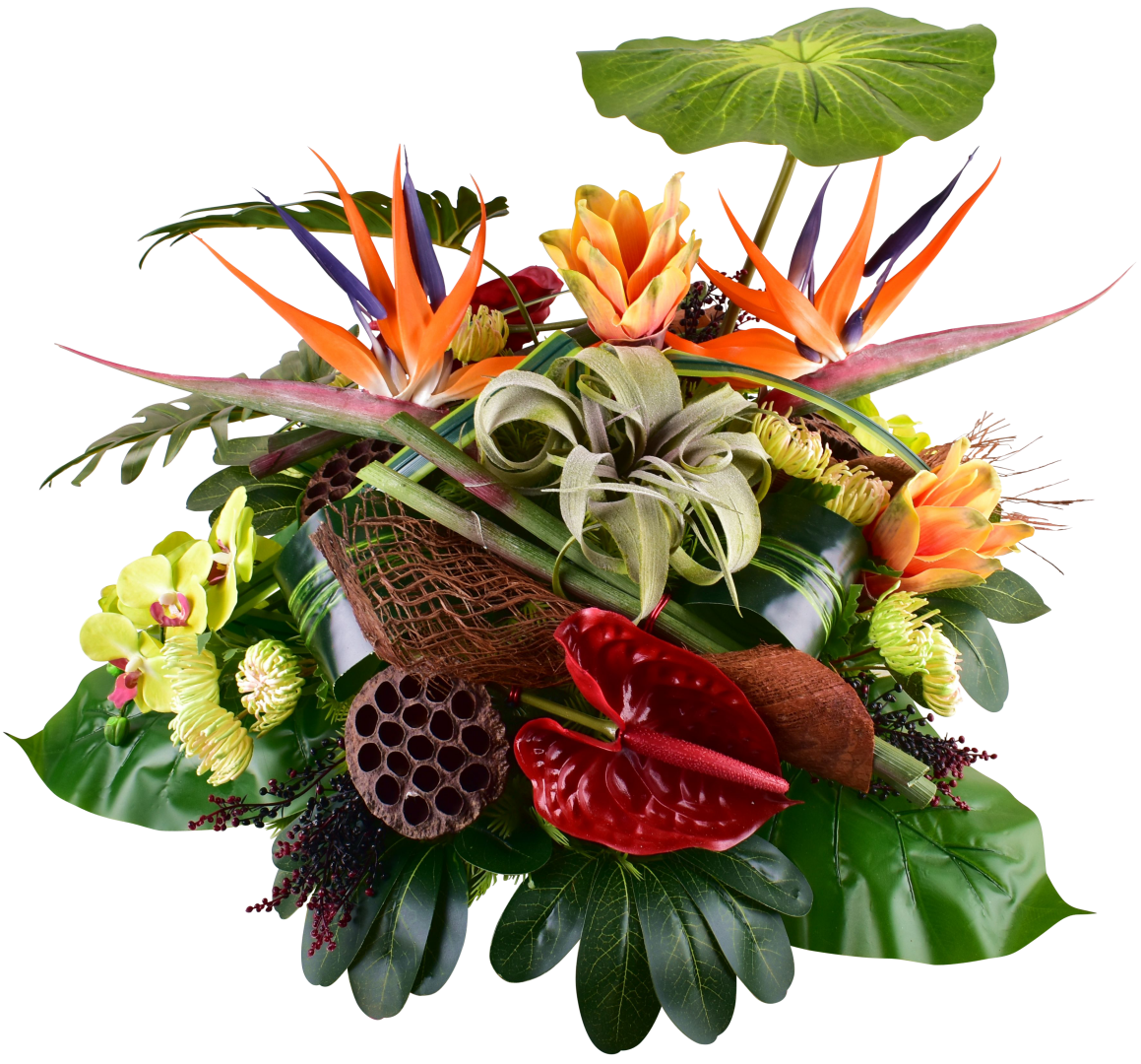 Coussin, héliconia, ginger, orchidée, anthurium, tillandsia.