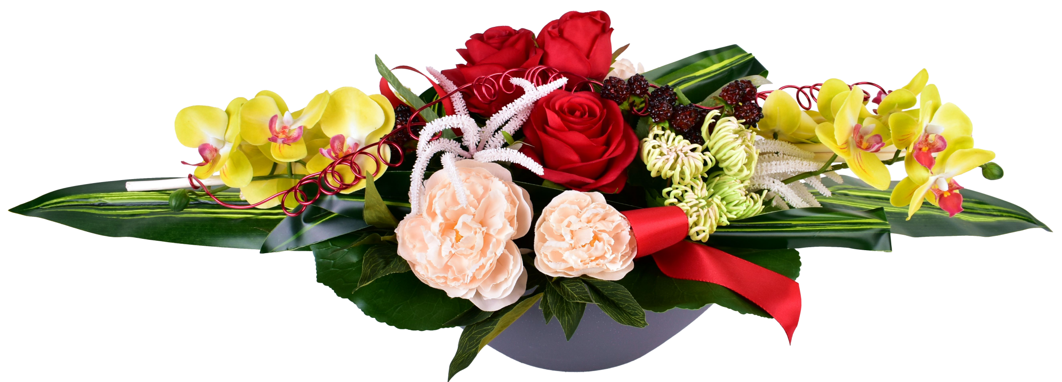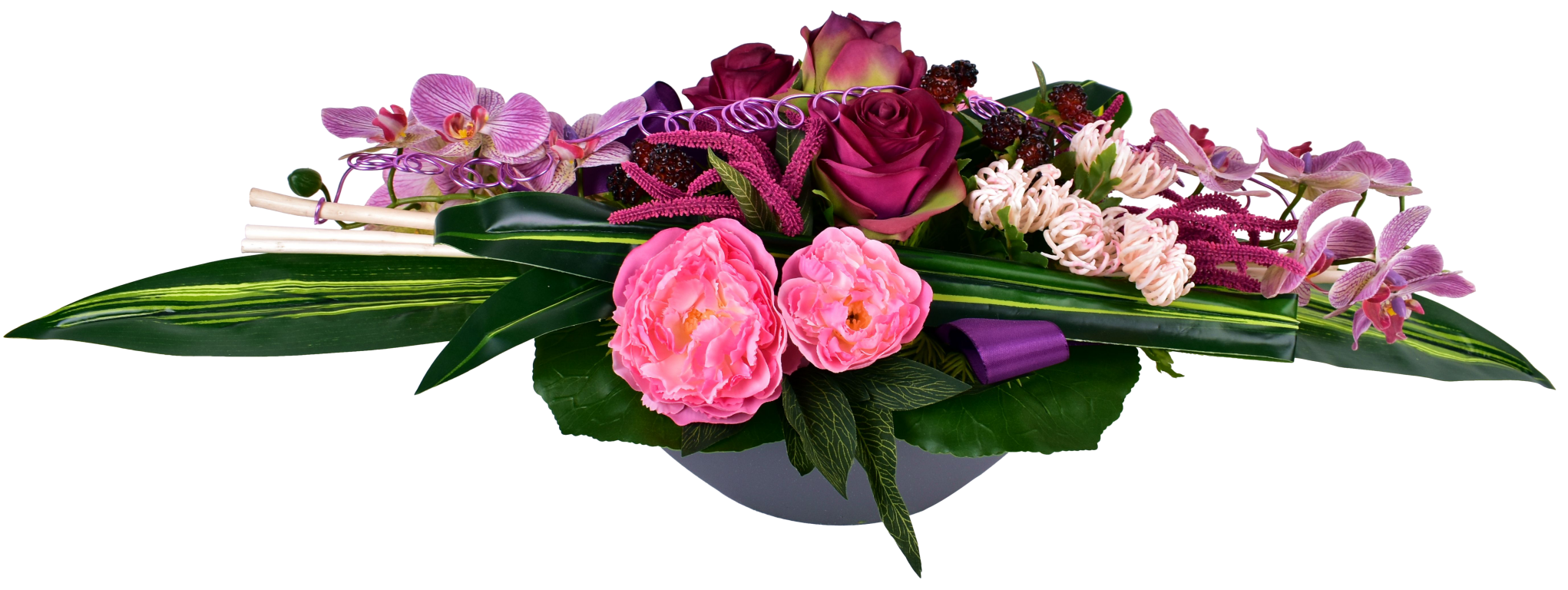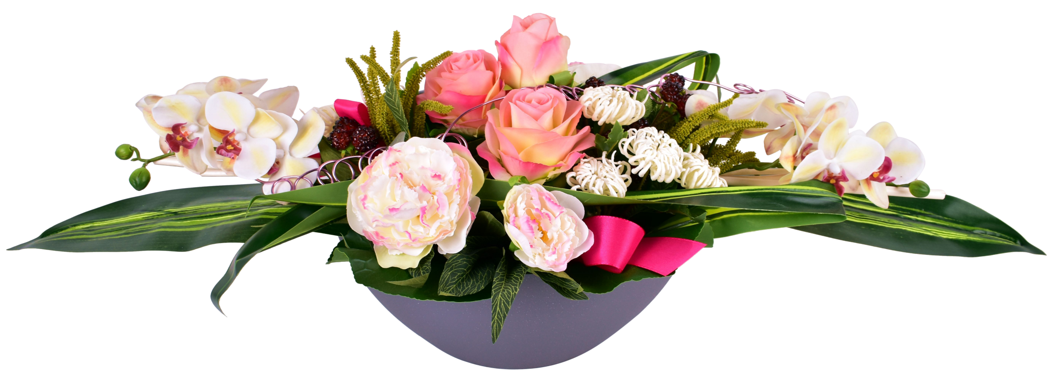 Jardinière oblonde, rose, pivoine, phalénopsis, astilbe, shamerock et ruban. Contenant lesté.