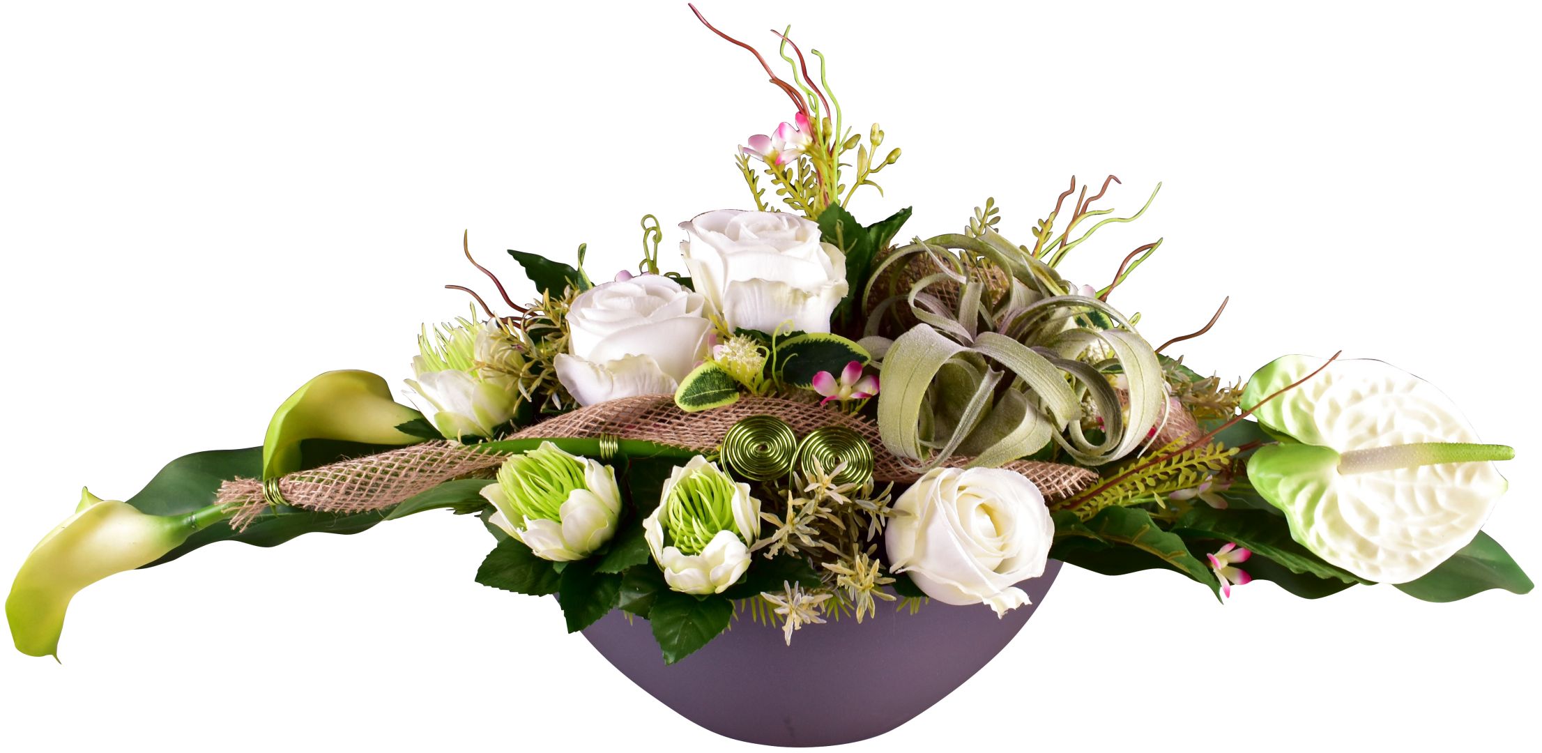 Coupe ovale, rose, protéa, fleurette, callas, anthurium, ruban jute, fil laiton.