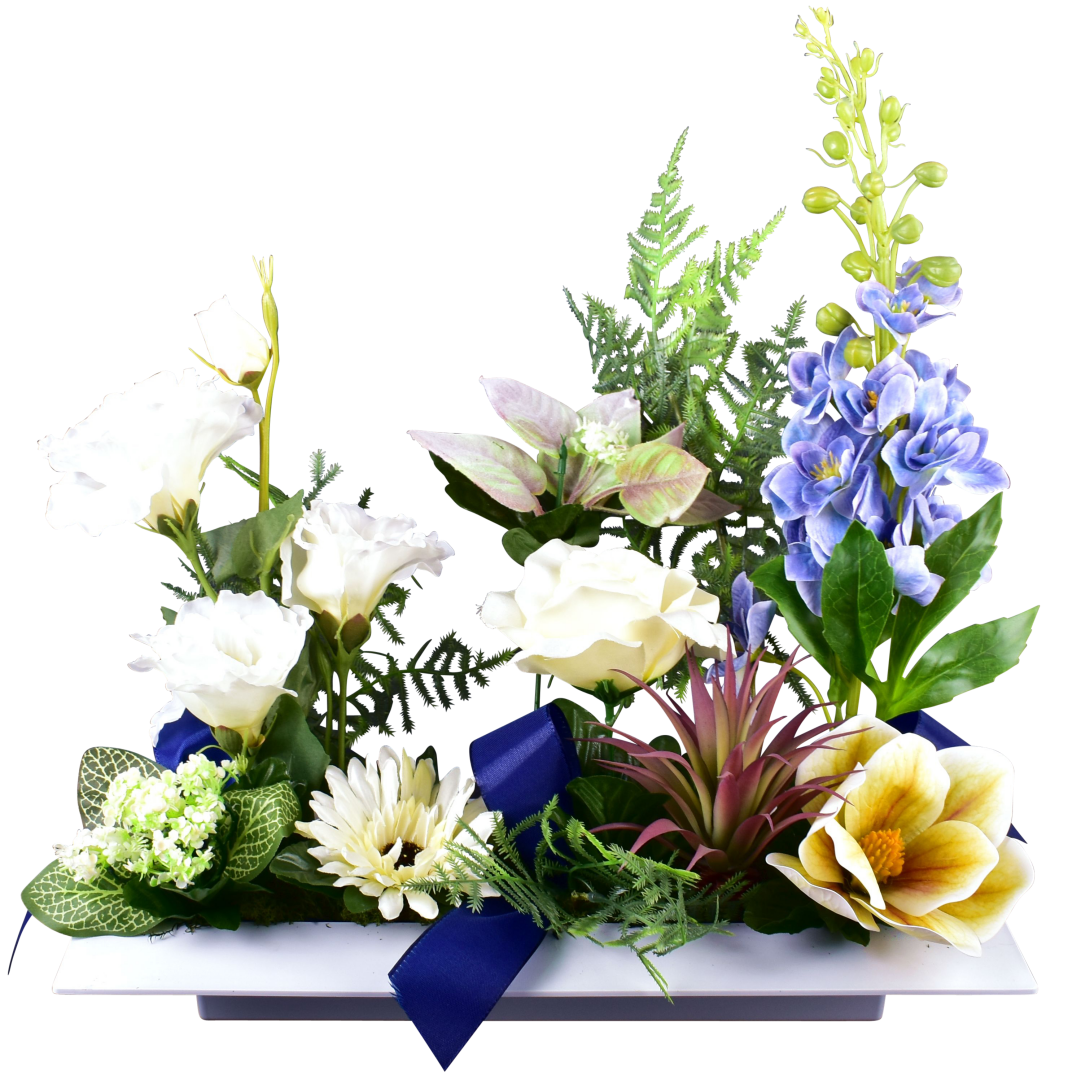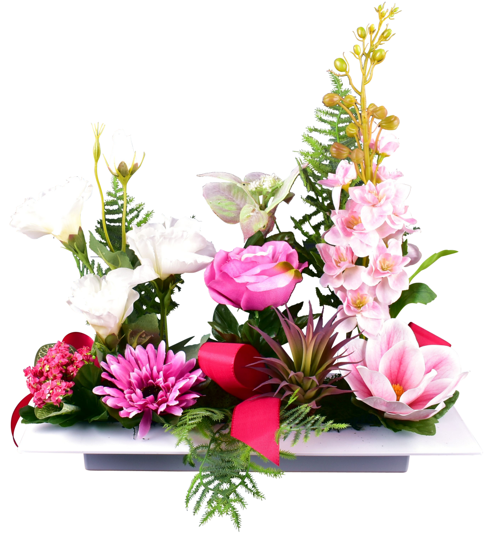 Ultra plate, rose, magnolia, gerbera, delphinium, succulent, ruban taffetas, support lesté.