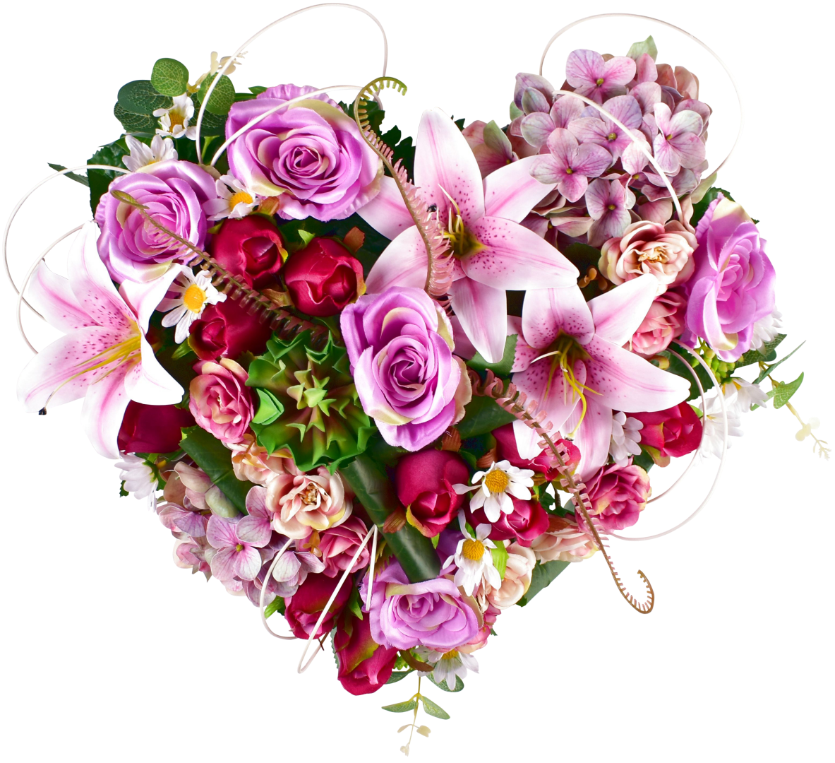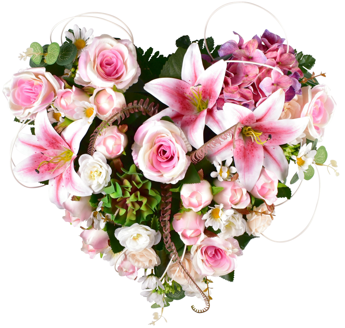 Coeur, rose, lys, boutons, hortensia, gardénia, echeveria, support lesté.