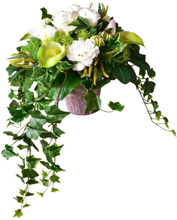 Coupe, rose, lysianthus, arum. Shamrock, astible, ruban perlé. Pot écorce lesté.