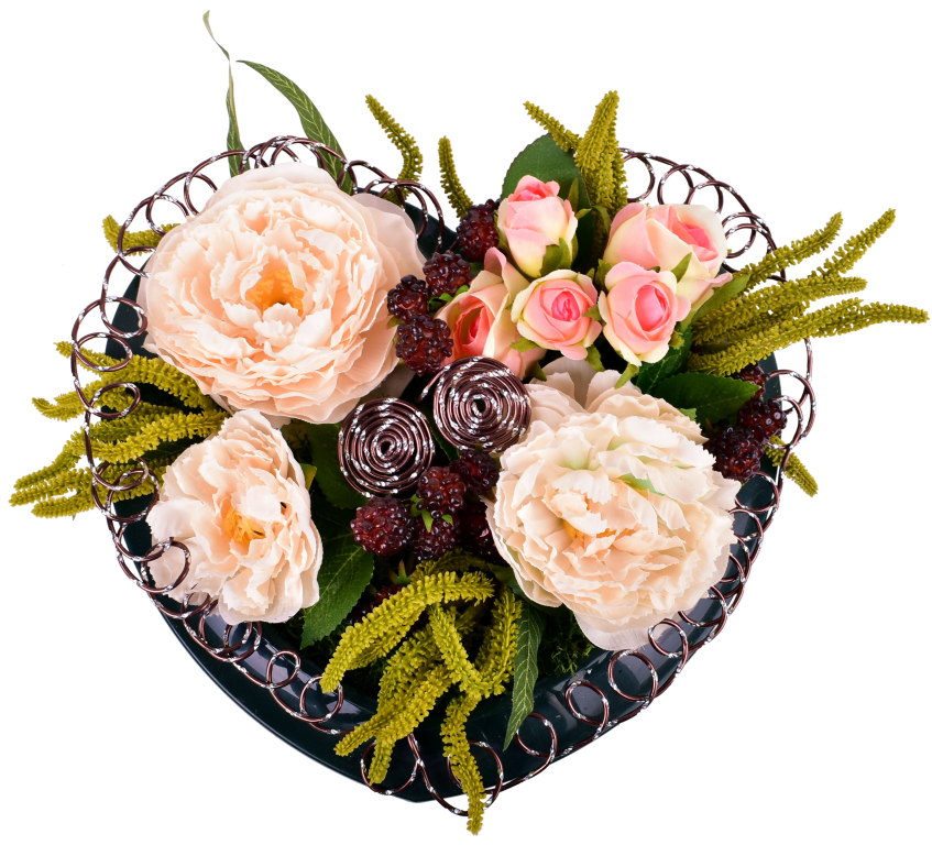 Plateau coeur, rose, pivoine, astilbe. Fil aluminium "diamant".